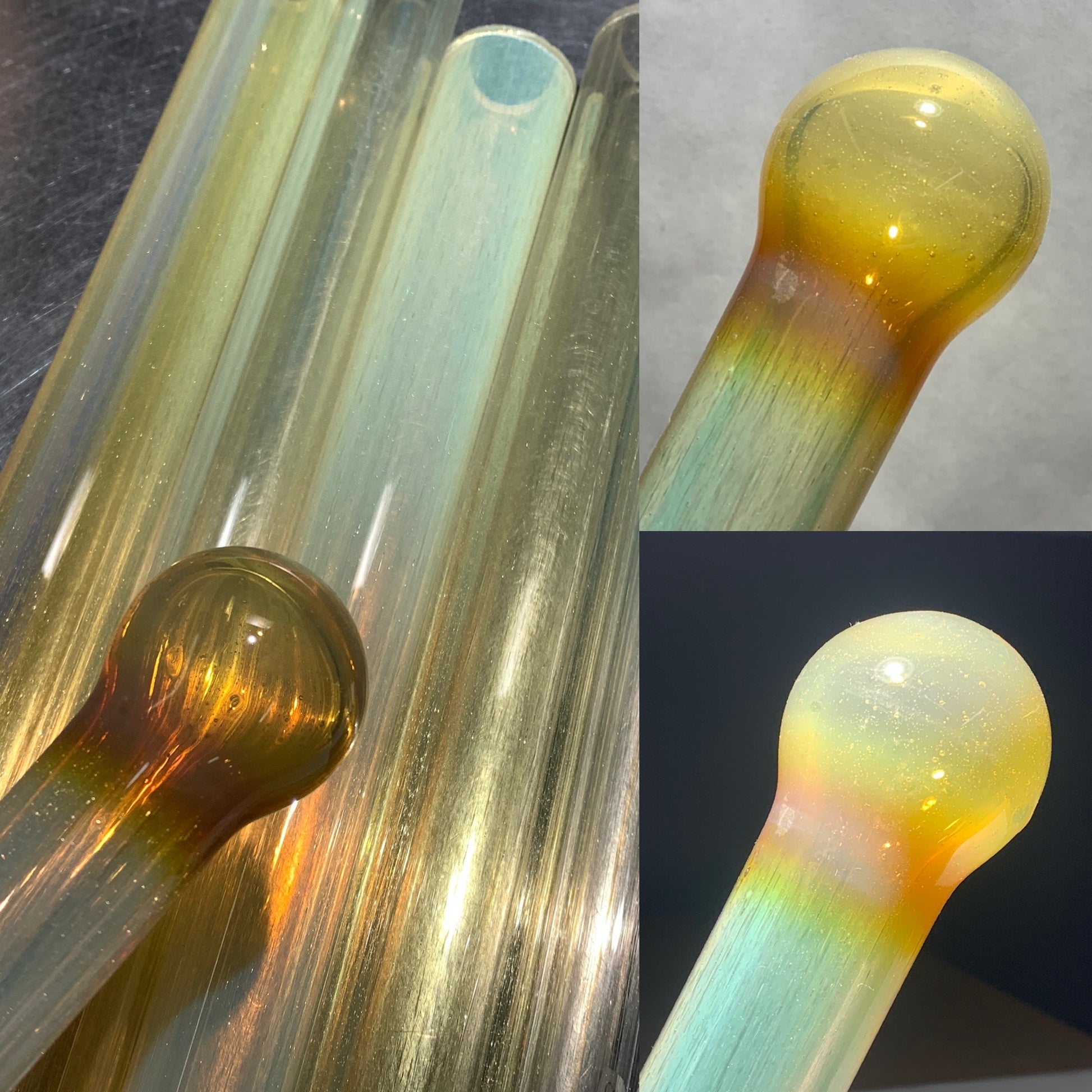A light yellowish color with playful silver striking characteristics. This is a subtle striker, great on its own or in combination/layers. Very much a classic borosilicate silver striker in a classic Greasy amber color.