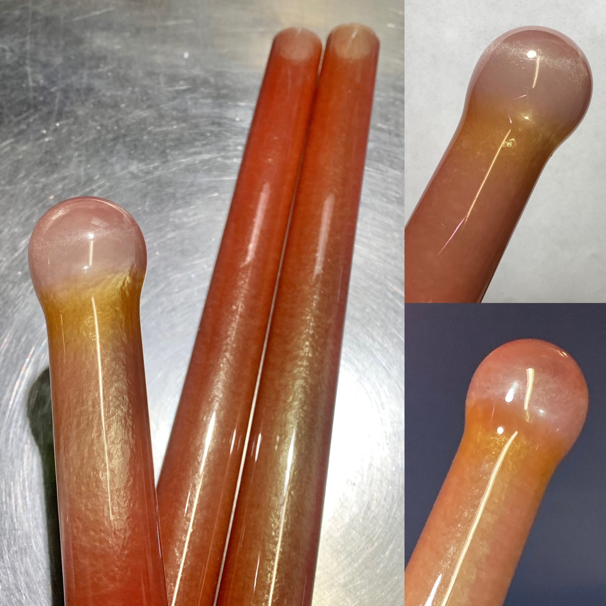 Exp. V8 has hues of green to orange over the shimmer of the Icy White Satin core.