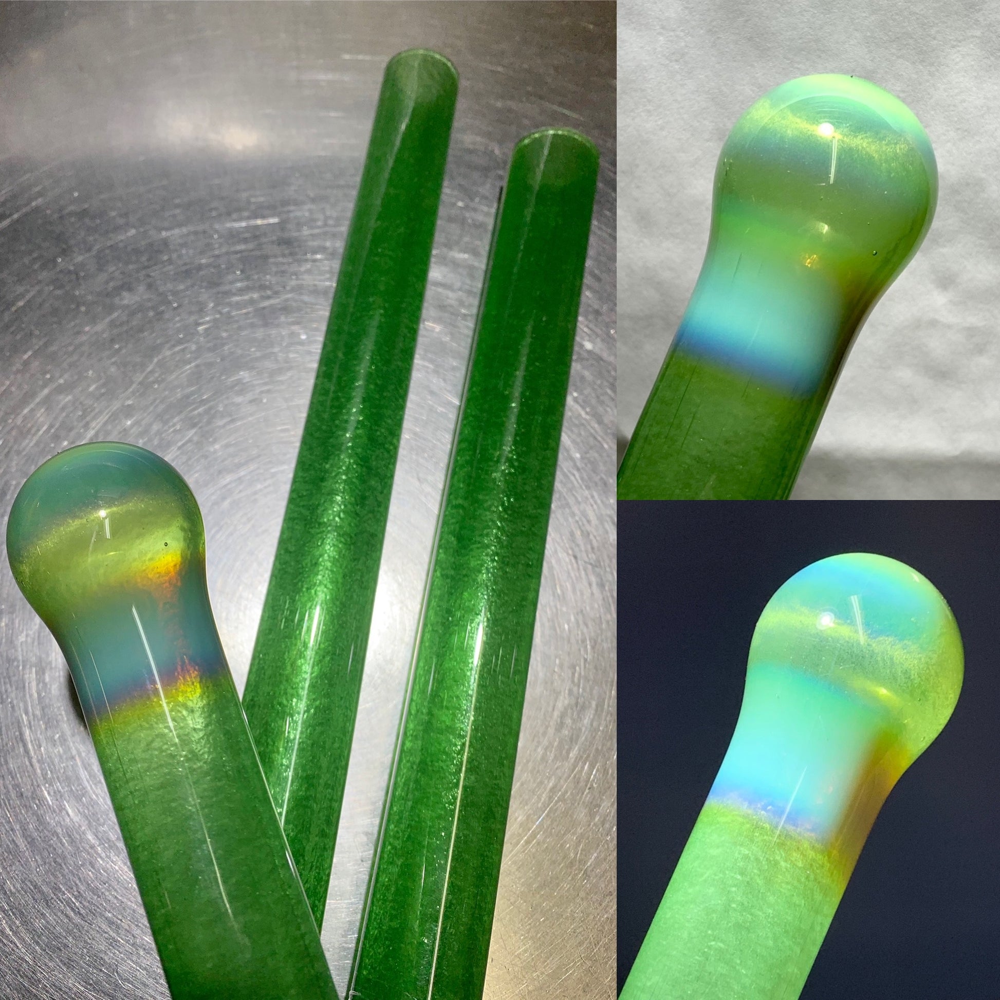 Green Energy with strong silver effect over Icy White Satin, resulting in a complex tube with UV reactivity and satin chatoyancy.