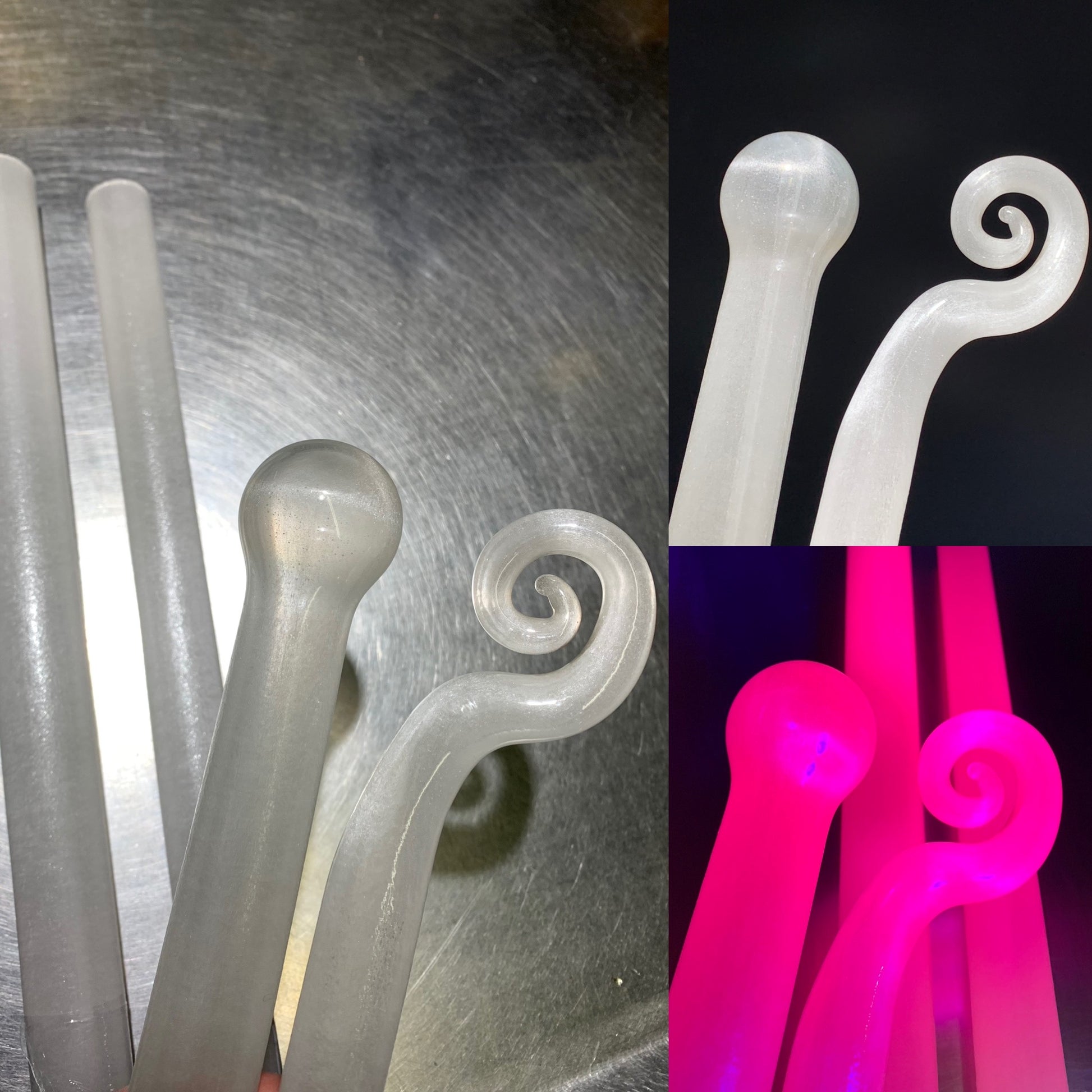 A wonderful variant of UV White Satin featuring a slightly less opaque color and slightly more dispersed satin content. This Icy version gives a little more room for light to pass through and illuminate the satin effect. This color likes to be worked cold and in a more oxidizing flame. Fantastic results from implosions and encasement.