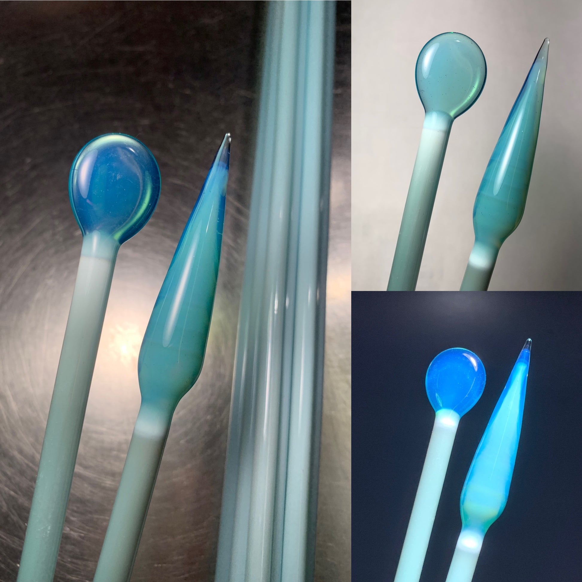 Crisp aquatic blue reminiscent of a clear pond on a bright summer day, Marina is a copper based opal blue. Marina is similar to and in the family of Hydro. Like all opal type colors, it will appear more transparent when worked hotter and more milky when worked cooler.
