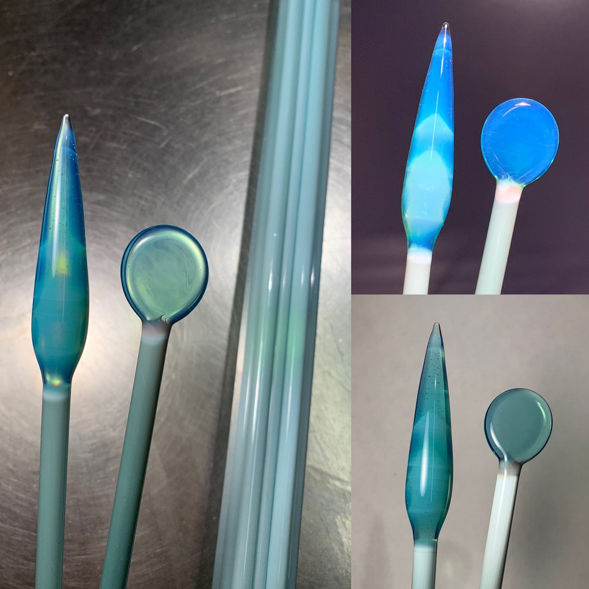 Crisp aquatic blue reminiscent of a clear pond on a bright summer day, Marina is a copper based opal blue. Marina is similar to and in the family of Hydro. Like all opal type colors, it will appear more transparent when worked hotter and more milky when worked cooler. This new batch is slightly more transparent than the last batch.