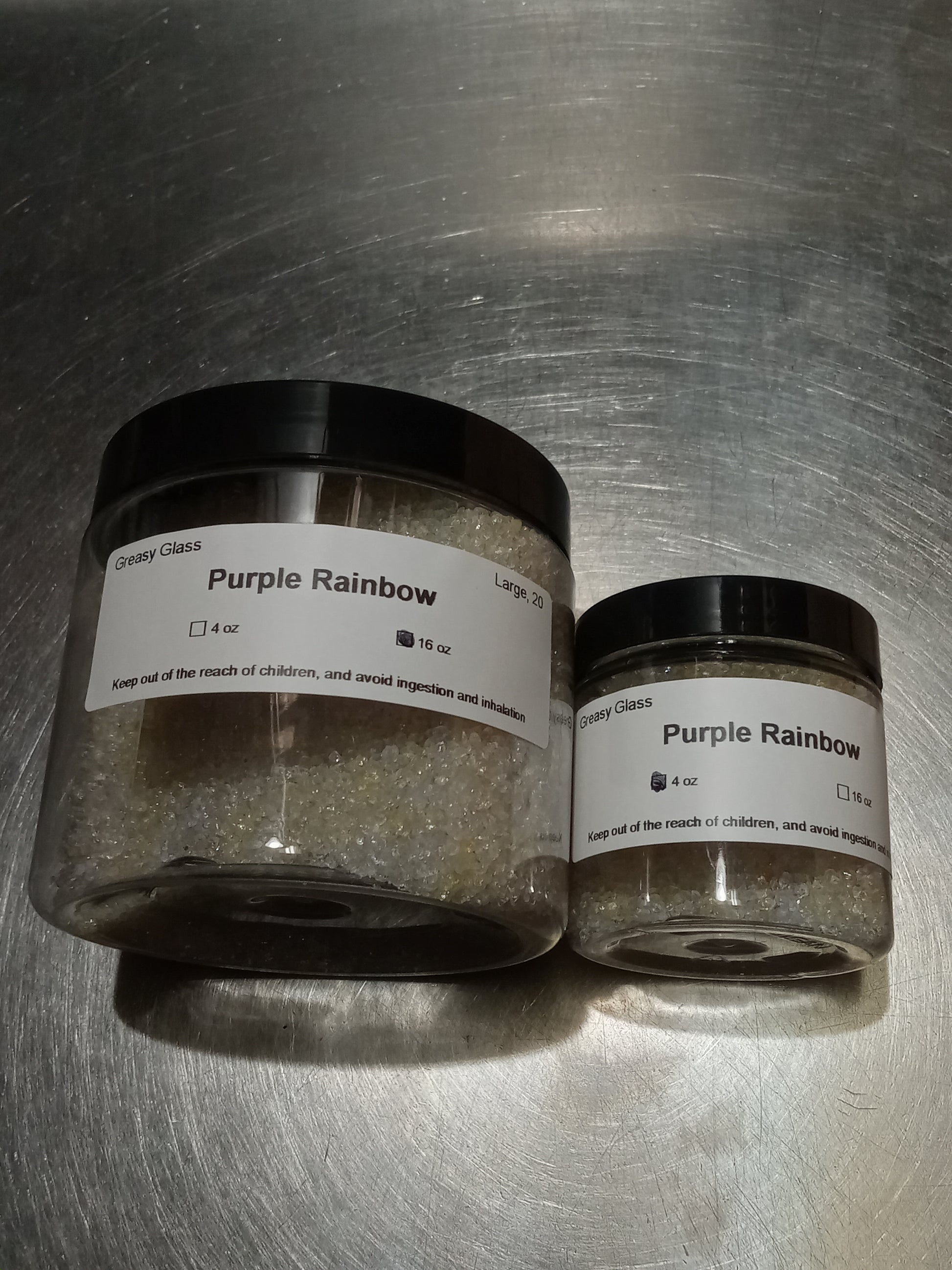 Purple Rainbow Frit. Purple Rainbow is a silver based striking color.