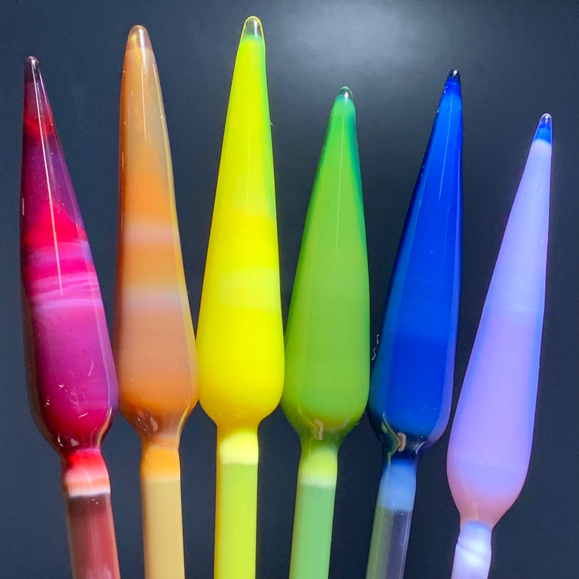 These rainbow sample packs are darker/dense opal colors. They contain two rods of each color, Dark Phoenix, Russet Opal, Yellow Opal Satin, Green Opal, Blueberry Opal, and Dense Neo Opal.