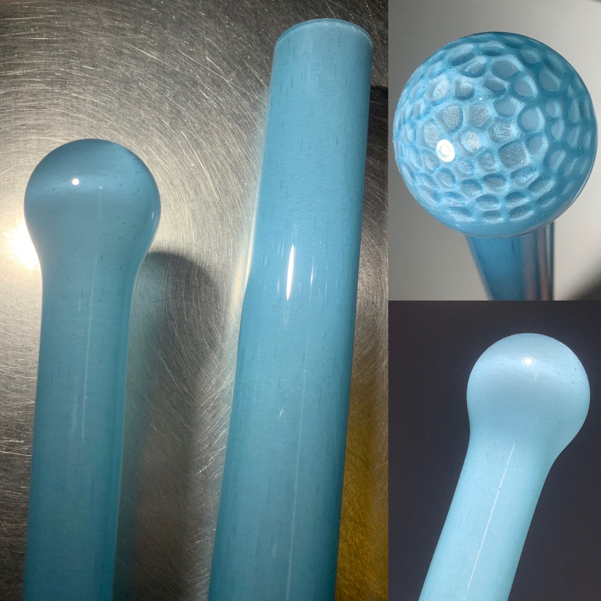 A transparent copper based blue over a satin white. This tubing works best in neutral to oxidizing flames or encased.